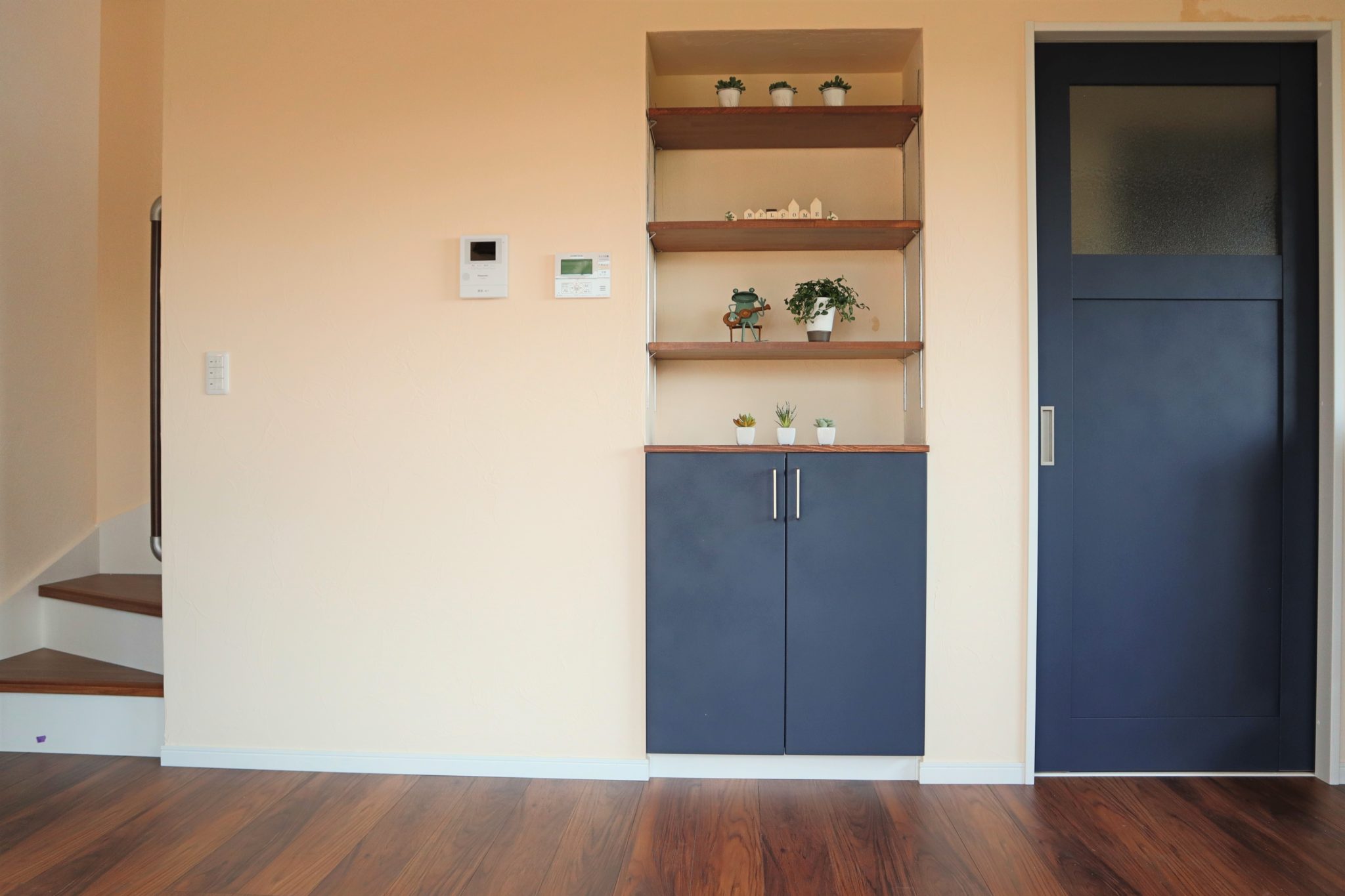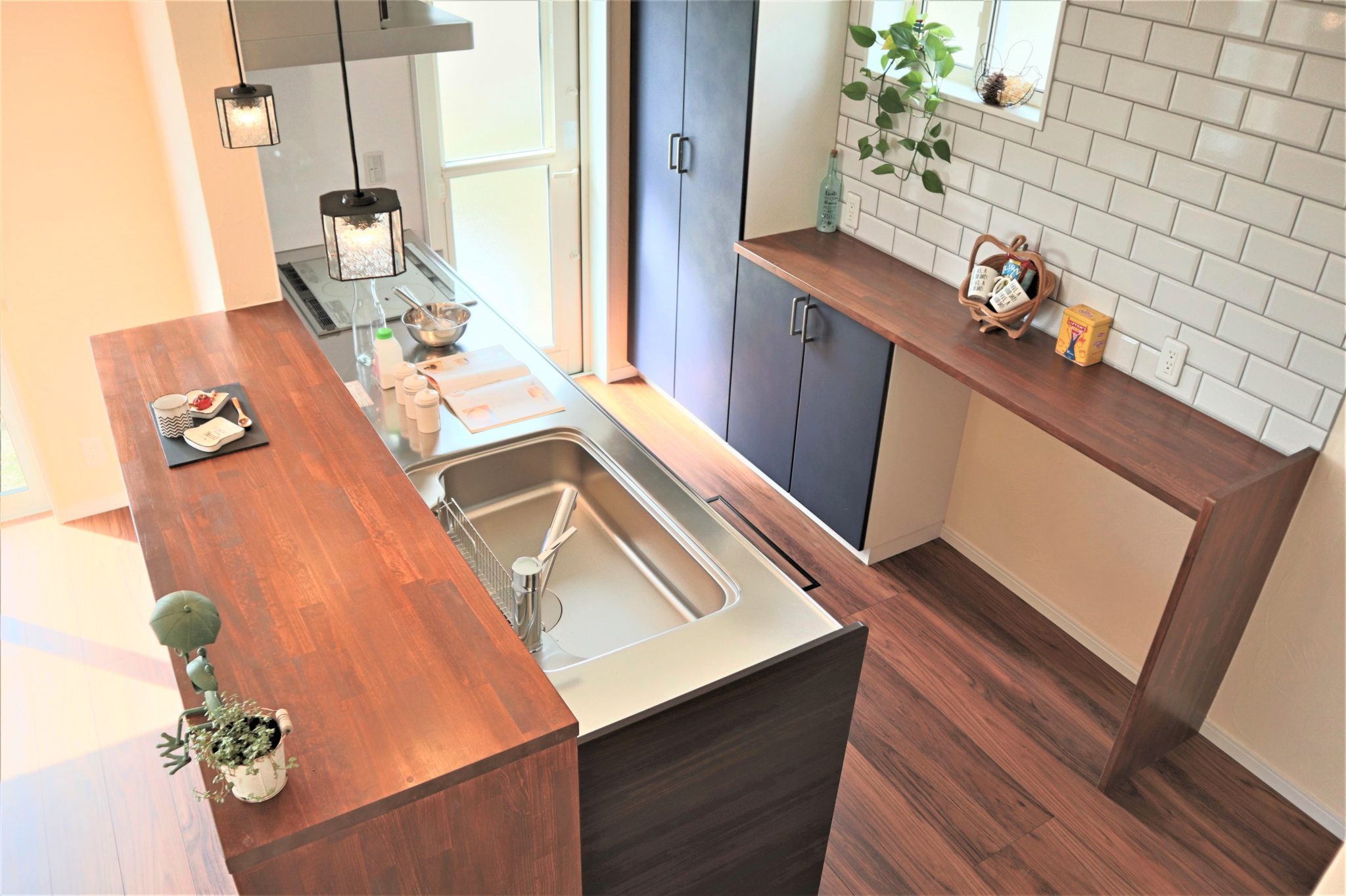 化粧梁、カーテンボックス、タイルの部分使いなど、M様のこだわりが光るLDKは、カフェ風のおしゃれで落ち着いた雰囲気。