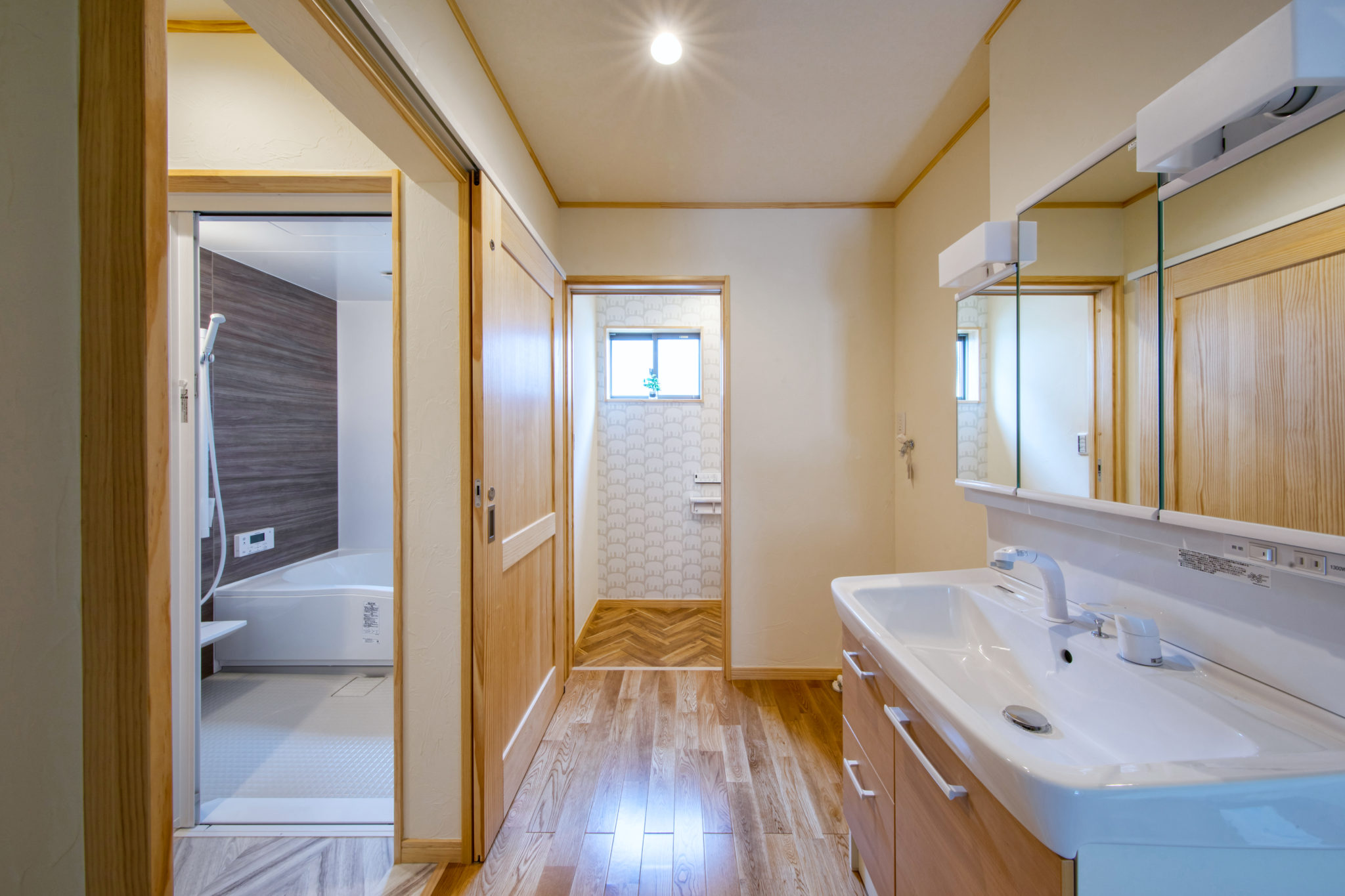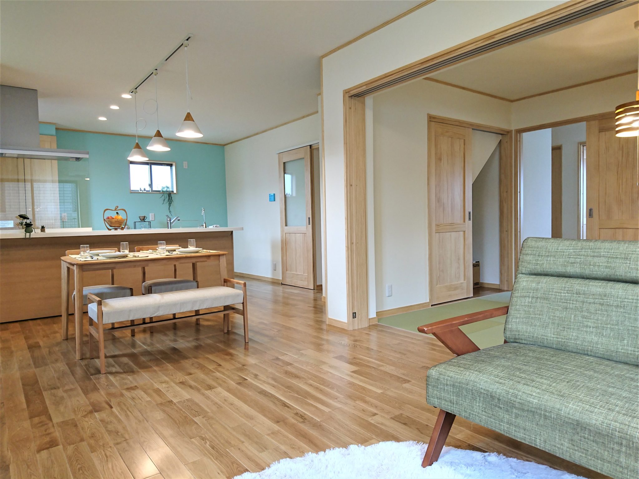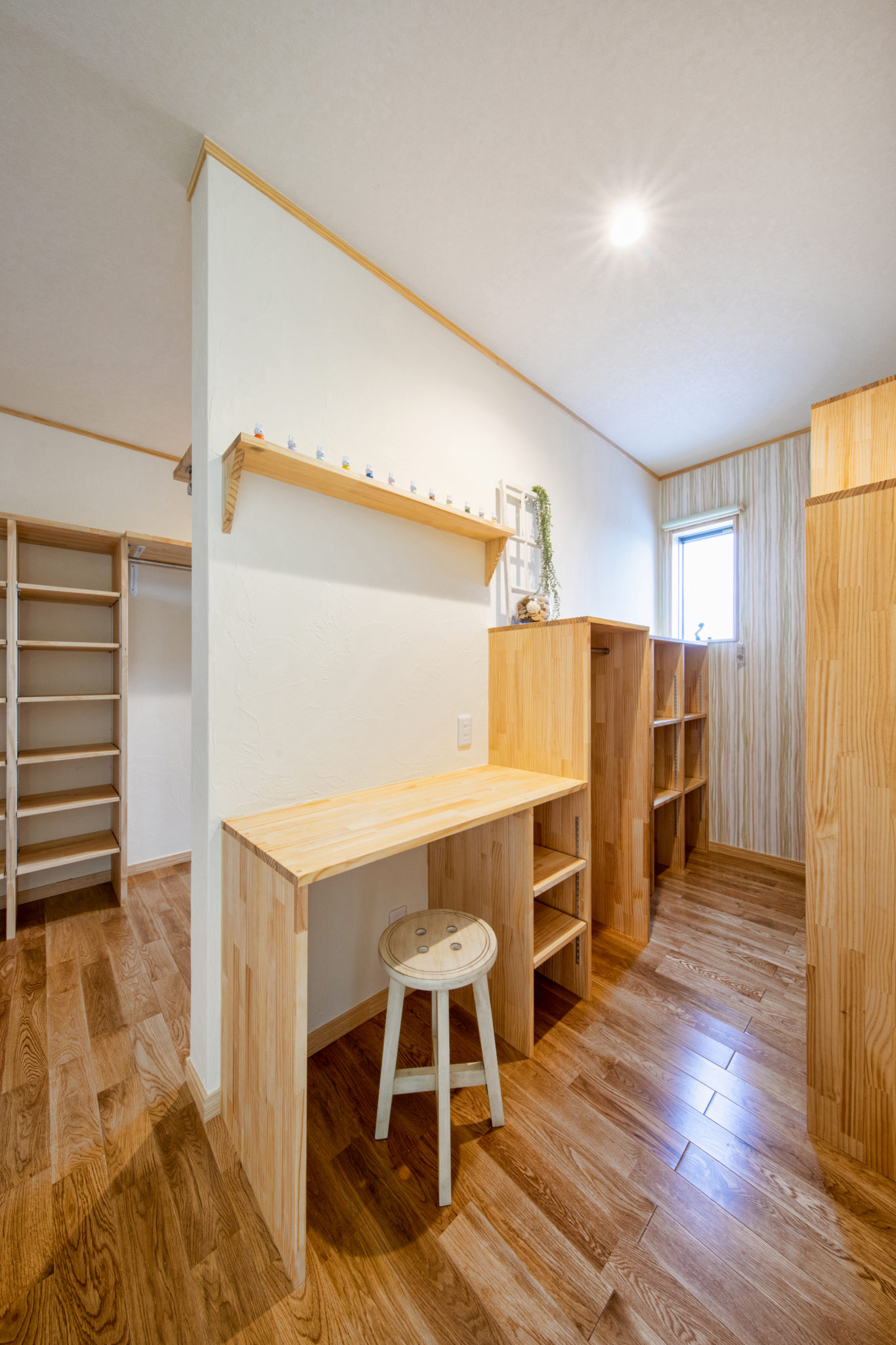 天然木が美しい床や建具、やわらかい風合いが特徴の珪藻土の塗り壁など、自然素材の温かみを感じることのできる内装は、仲良し一家のO様邸のイメージにぴったり。使い勝手の良さと居心地の良さが自慢の二世帯住宅です。