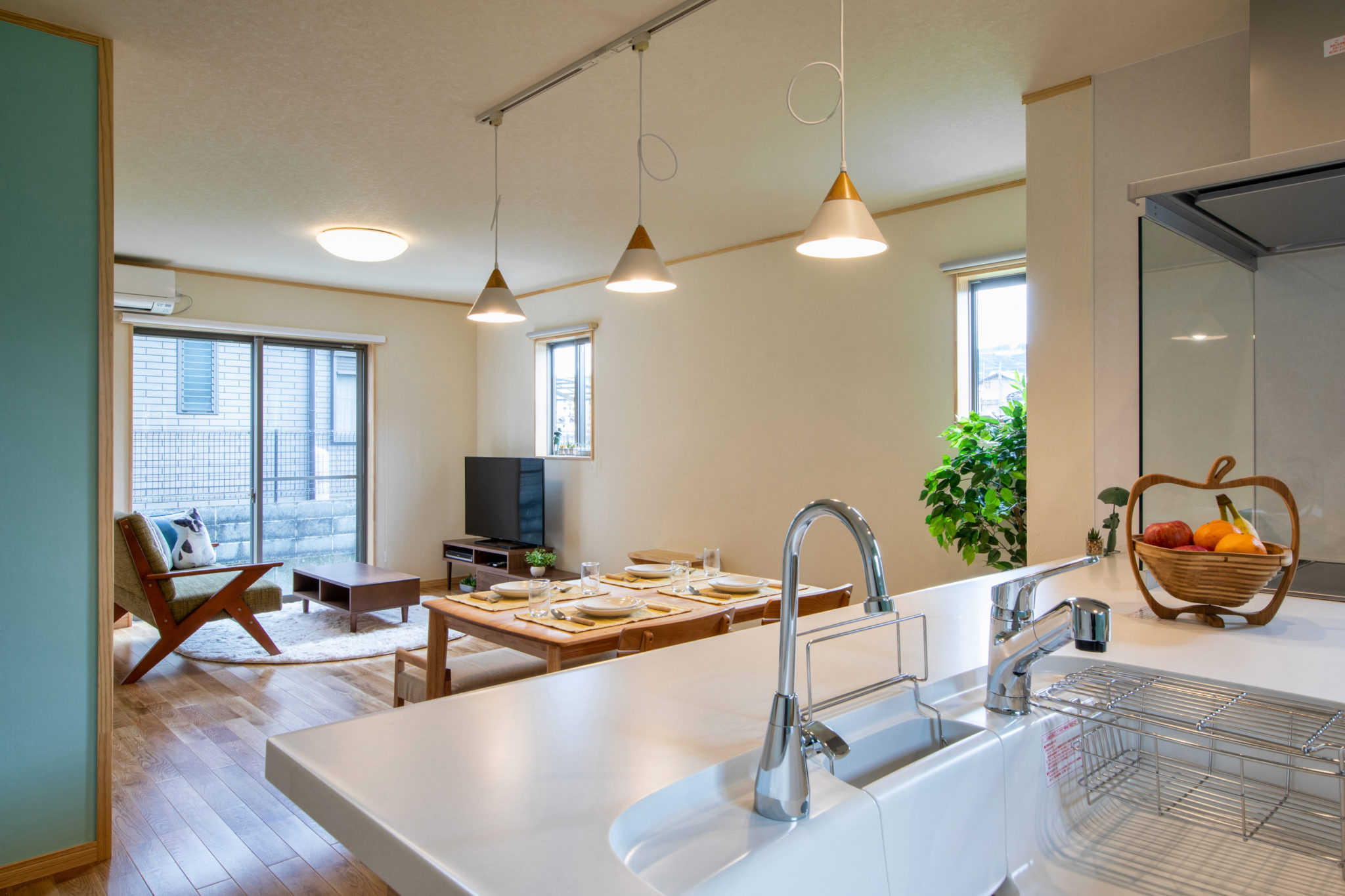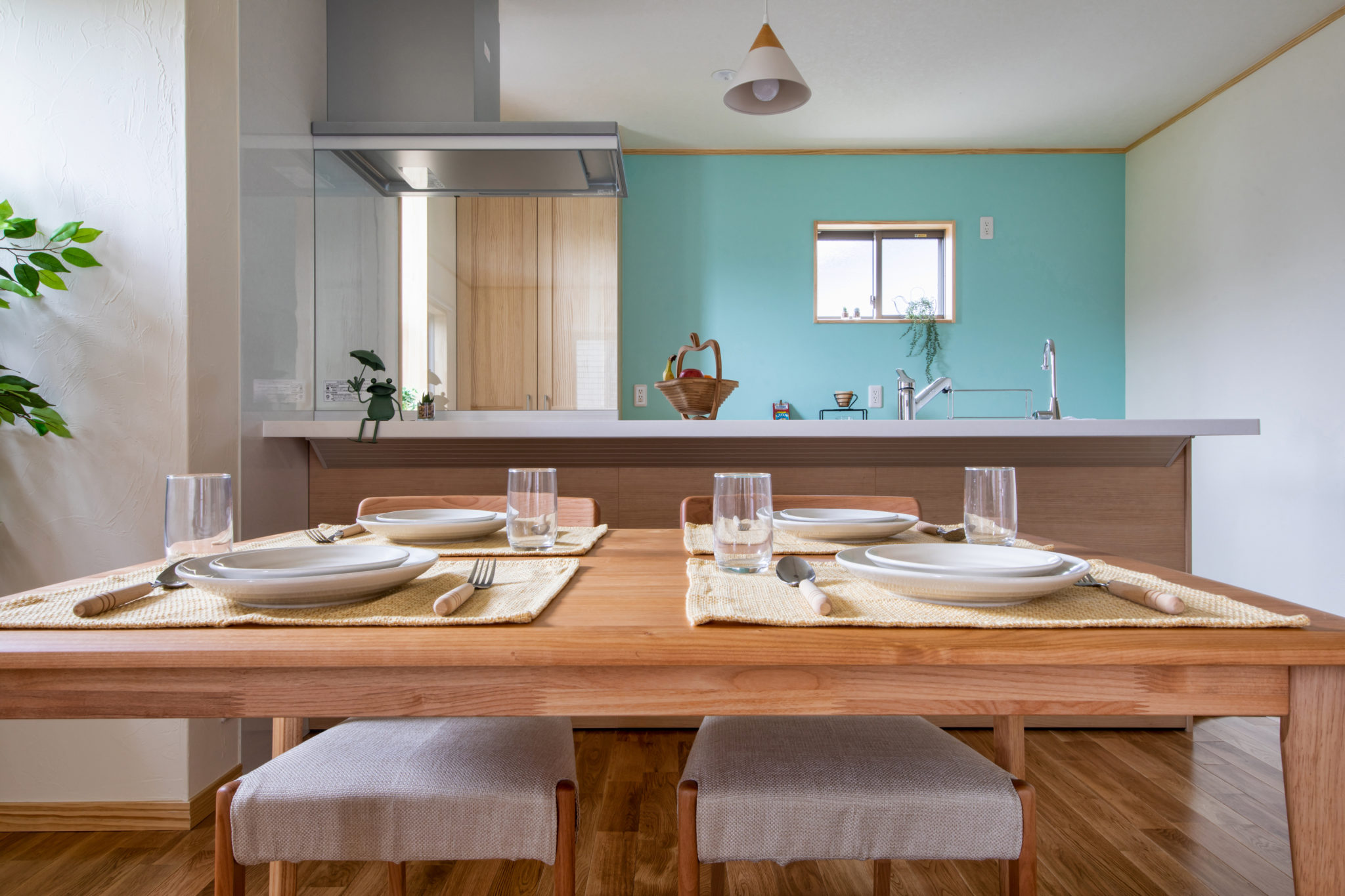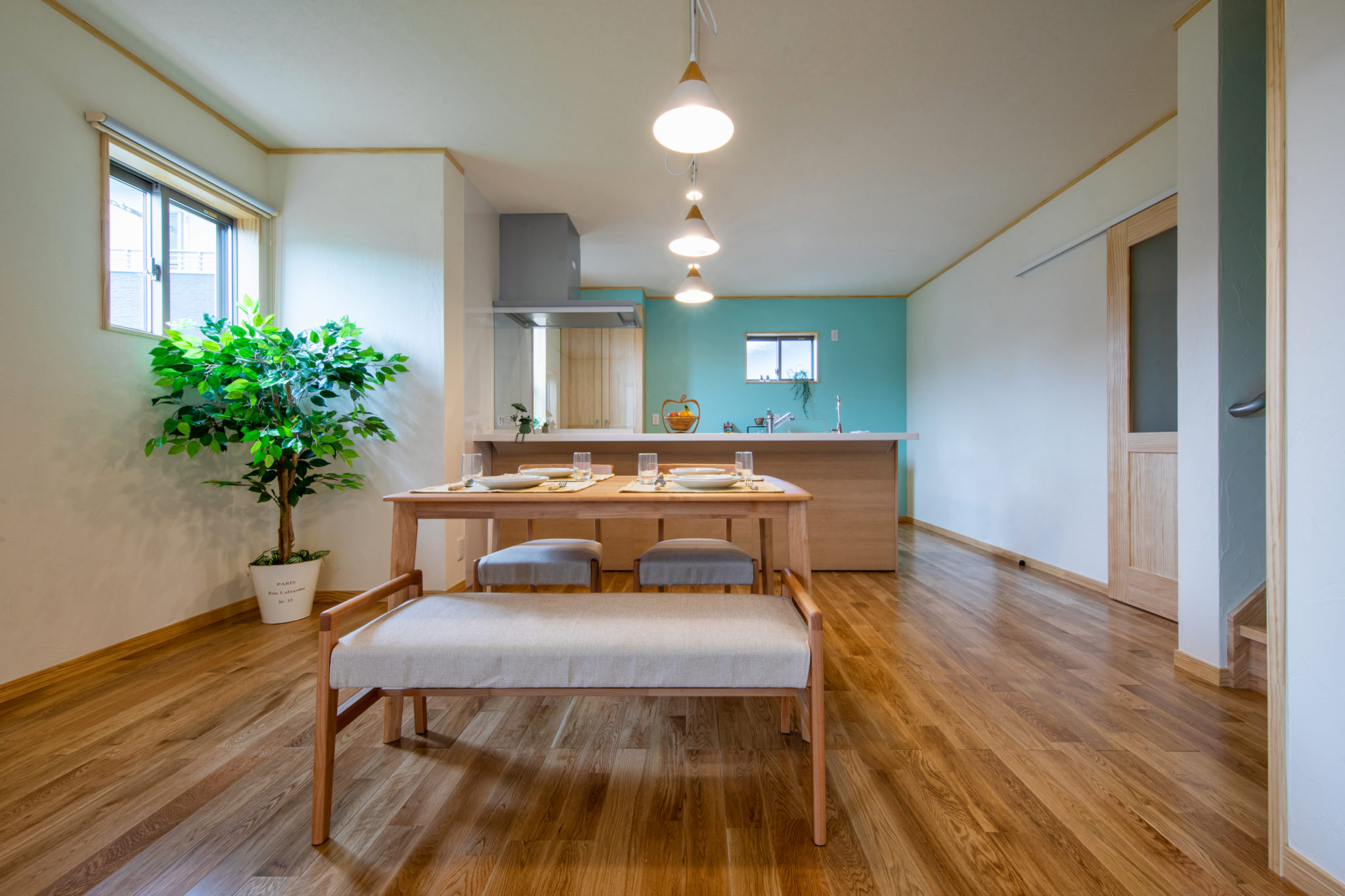 天然木が美しい床や建具、やわらかい風合いが特徴の珪藻土の塗り壁など、自然素材の温かみを感じることのできる内装は、仲良し一家のO様邸のイメージにぴったり。使い勝手の良さと居心地の良さが自慢の二世帯住宅です。