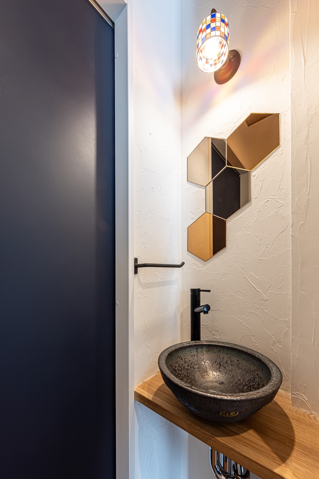 信楽焼の洗面ボウルが目を引く造作の手洗いスペース。